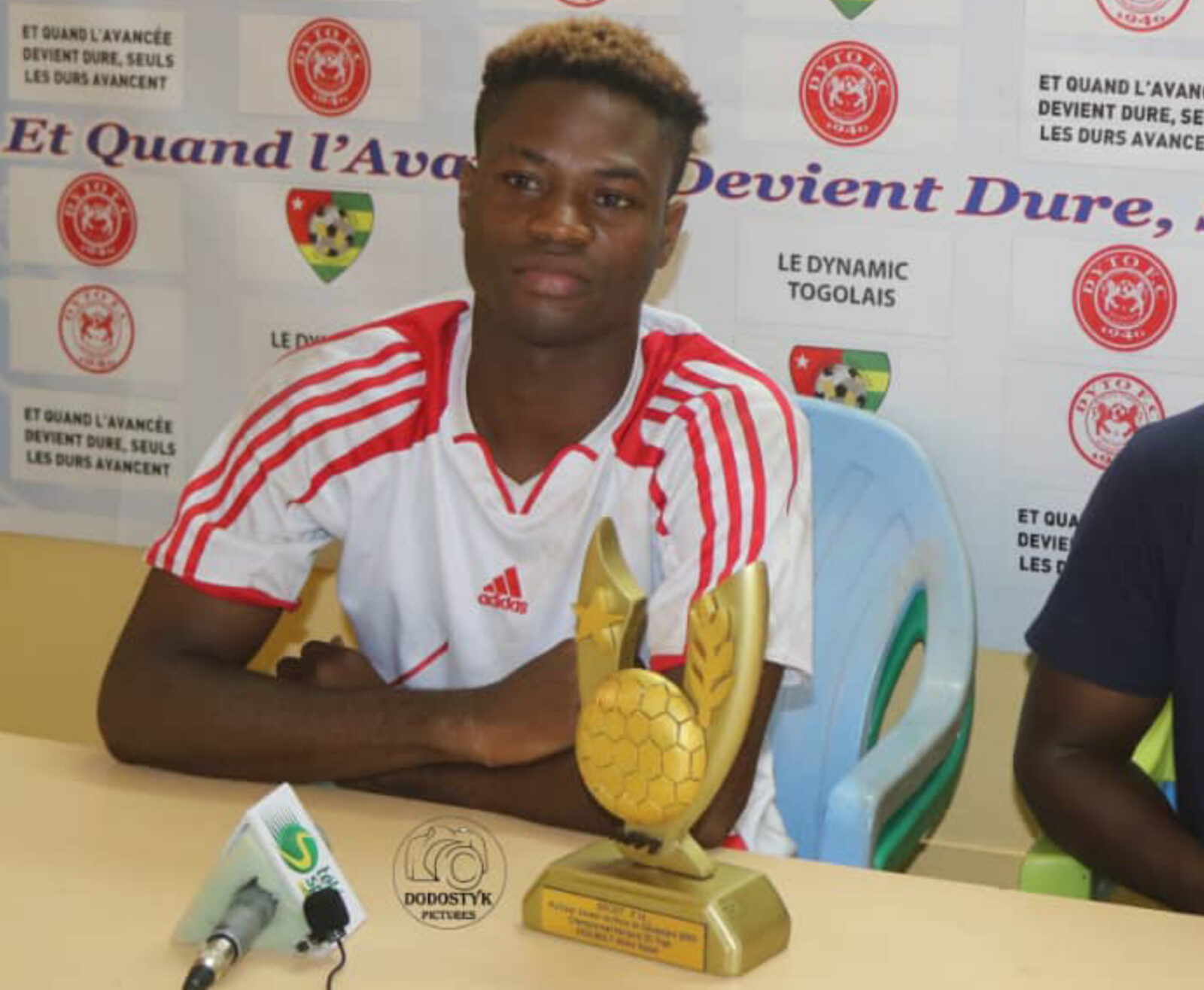 L’attaquant du Dynamique Togolais a reçu son prix composé entre autres, d’un trophée et d’une enveloppe, des mains de AMADOU Watara, représentant de la Fédération Togolaise de Football. Ce dernier était accompagné du président de l’Association des Joueurs de Football du Togo, (AJFT) et de M. OURO Moustapha. Le commandant Akpo Kondi représentait le club de Dyto, à cette cérémonie.