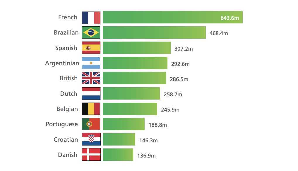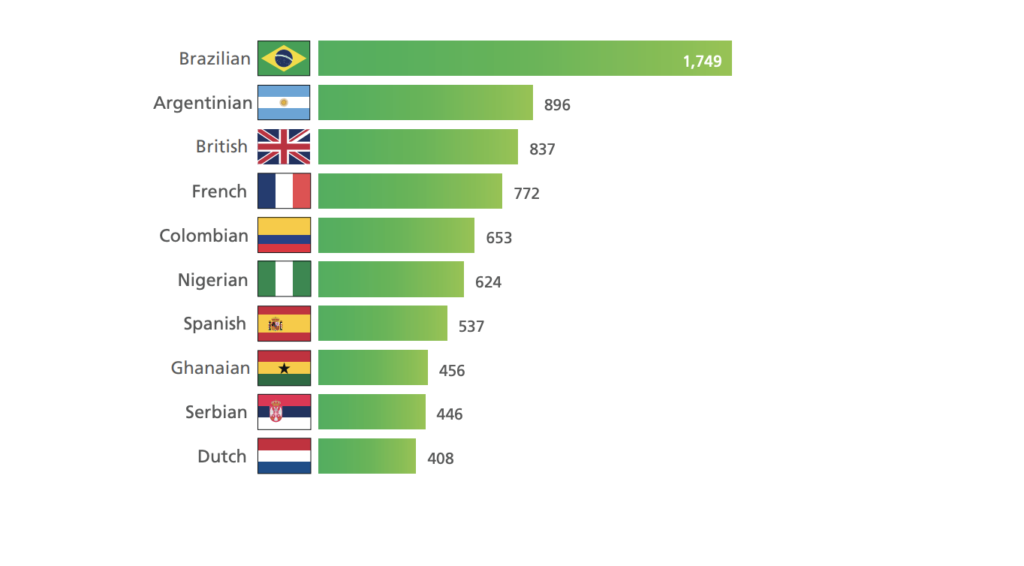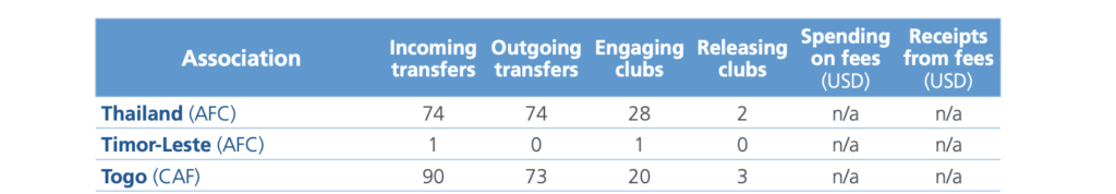 Le document précise que « toutes les données de transfert fournies dans le rapport concernent uniquement les transferts internationaux de joueurs de football au sein de la champ d’application du football à 11 ».