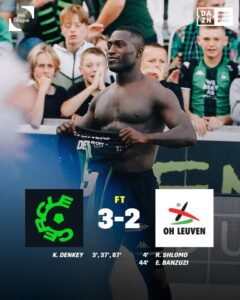 L’attaquant togolais Kevin Denkey a brillé de mille feux ce samedi 07 octobre 2023 dans la confrontation entre son club le Cercle Brugge et OH Leuven en inscrivant un triplé. Grâce à cette performance, il permet à son équipe de renouer avec la victoire après trois journées de disette. Score final : 3-2.