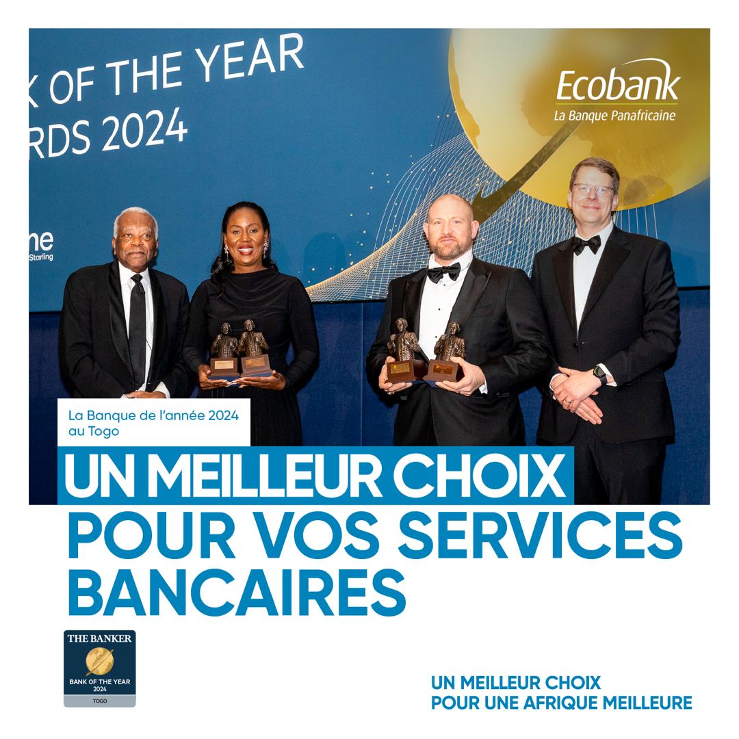 Ecobank a été désigné Banque de l’année au Togo à la faveur de l’édition 2024 du Bank of the Year Award. Cette distinction qui est la cinquième consécutive pour la Banque panafricaine traduit la qualité, l’innovation, l’accessibilité et l’adéquation qui sont le propre des solutions financières d’Ecobank.