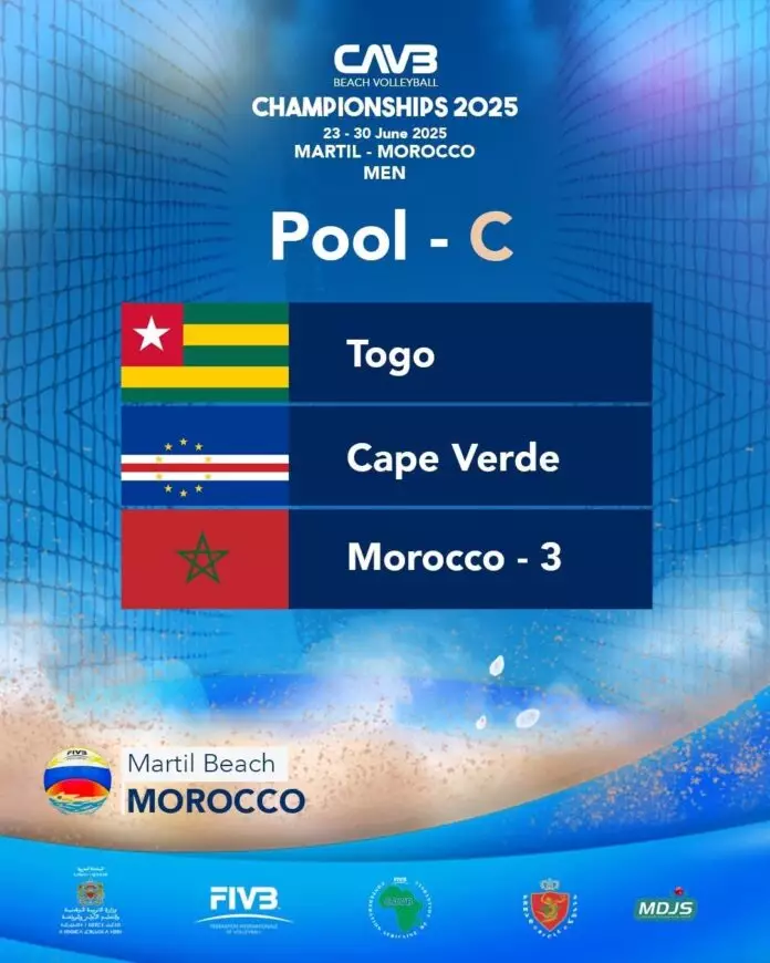 Le tableau des groupes masculins issus du tirage au sort de la Coupe Continentale Senior Martial 2025 reflète la richesse et la diversité du beach-volley africain. Le Maroc qui abrite la compétition bénéficie d’une forte représentation avec trois équipes qui sont réparties dans les poules A, B et C. Le Togo est logé dans la poule C avec le Cap-Vert, mais également une des équipes marocaines.