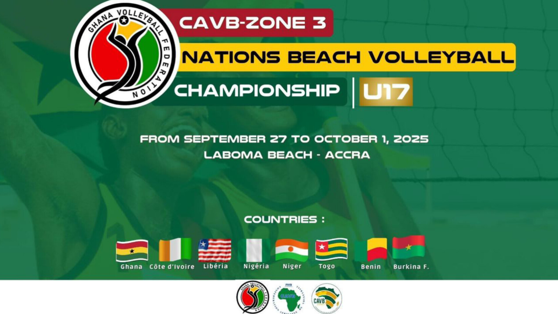 Le Togo participe au Championnat des Nations de Beach Volleyball des moins de 17 ans. Cette compétition à l’initiative de la zone 3 de la Confédération Africaine de Volleyball, se déroule du 27 septembre au 1er octobre 2025 sur la plage de Laboma, à Accra.