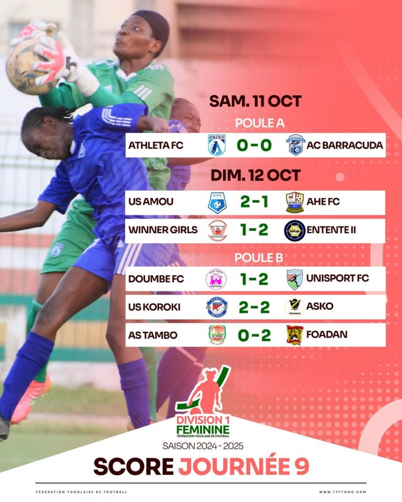 La phase retour de la D1 Féminine du Togo poursuit son cours et la neuvième journée a offert son lot de rebondissements ce dimanche 12 octobre 2025. Si Entente 2 s’affirme avec une deuxième victoire consécutive, l’ASKO de Kara voit sa série invaincue stoppée dans un duel plein de suspense.