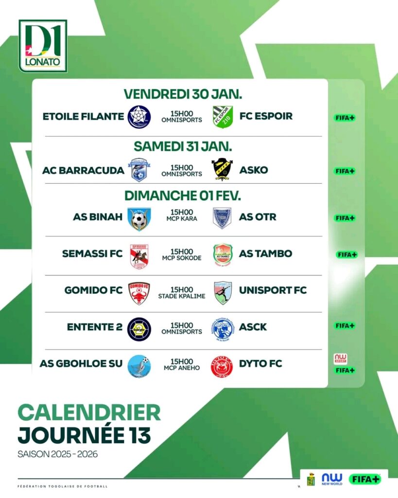La 13ème levée de la D1 Lonato démarre déjà ce vendredi 30 janvier 2026 avec l’Etoile Filante victorieuse en précédente journée et donc revigorée, qui va défier à domicile le FC Espoir du Zio, toujours mal en point.
