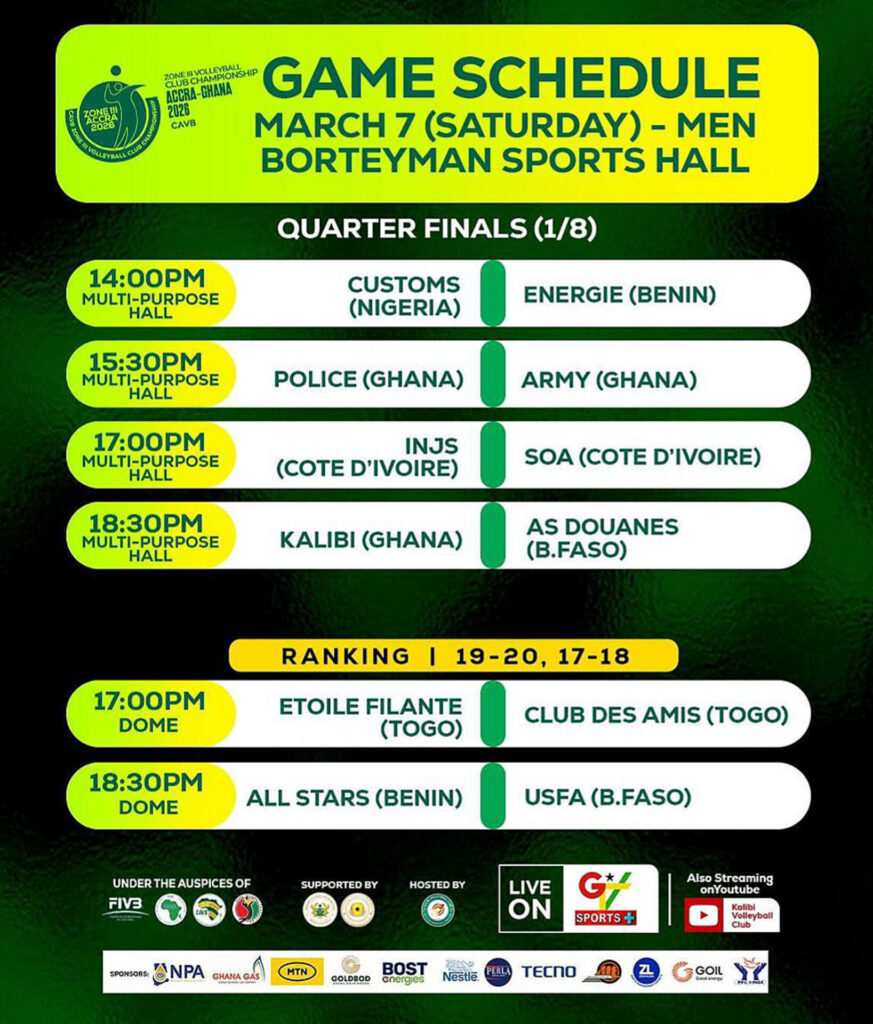 La Coupe des Clubs Champions de la Zone 3 de la Confédération Africaine de Volleyball entre dans sa phase décisive ce samedi 7 mars 2026 au Borteyman Sports Hall de Accra, mais sans les Togolais.