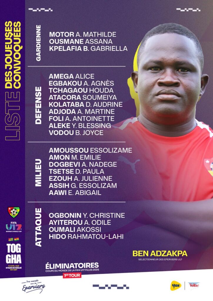 Ben Tété Adzakpa le sélectionneur des Eperviers U17 Filles, Ben Adzakpa a dévoilé la liste des joueuses retenues pour le double duel face au Ghana. Cette confrontation entre dans le cadre des éliminatoires du Mondial U17.