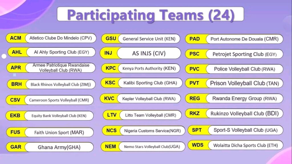 Ils sont 24 clubs masculins venus des quatre coins de l’Afrique à se lancer à l’assaut du prestigieux trophée continental. Cette forte participation témoigne de la vitalité et de la progression constante du volleyball africain.